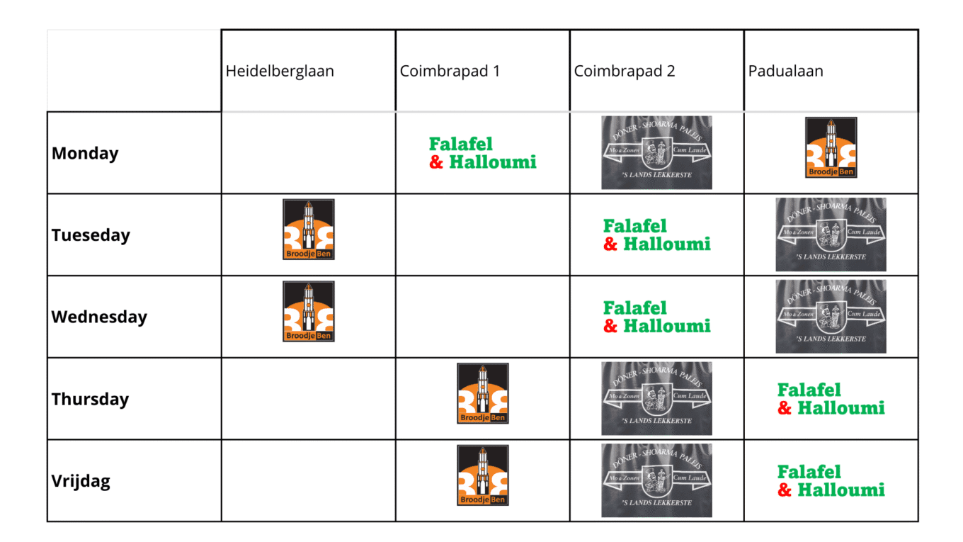 Below you can see on which day your favourite foodtruck will be present. Broodje Ben, Falafel&Halloumi and Mo & Sons will be happy to welcome you for a delicious lunch.