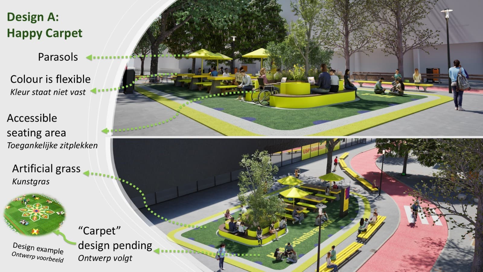 Zo bevat één van de ontwerpen opvallend genoeg kunstgras. ‘Dat was oorspronkelijk gewoon gras’, vertelt Rania. ‘Maar toen rees dus de vraag hoe reeël dat was. Gras wordt snel modderig. Dus kozen we hiervoor, “happy carpet“. In Rotterdam ligt dat op het Schouwburgplein en het werkt goed.’